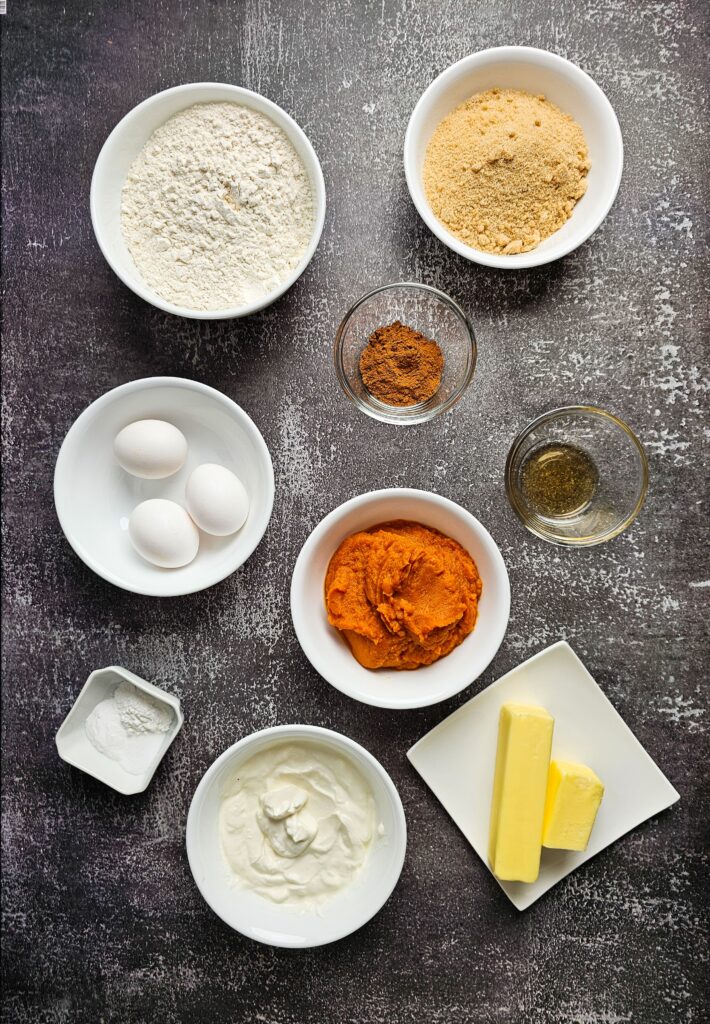 In a large mixing bowl, cream butter and brown sugar until fluffy (2–3 minutes). Beat in eggs one at a time, then add pumpkin purée, vanilla, and sour cream. Slowly add dry ingredients and mix until just combined.