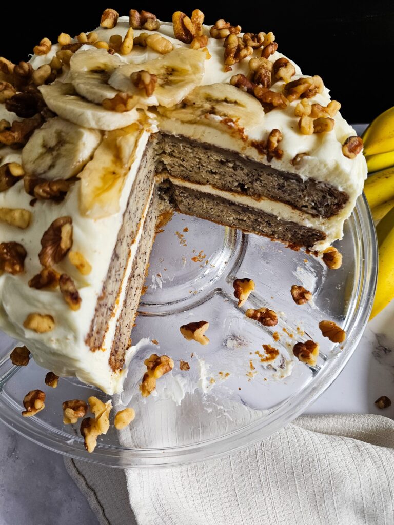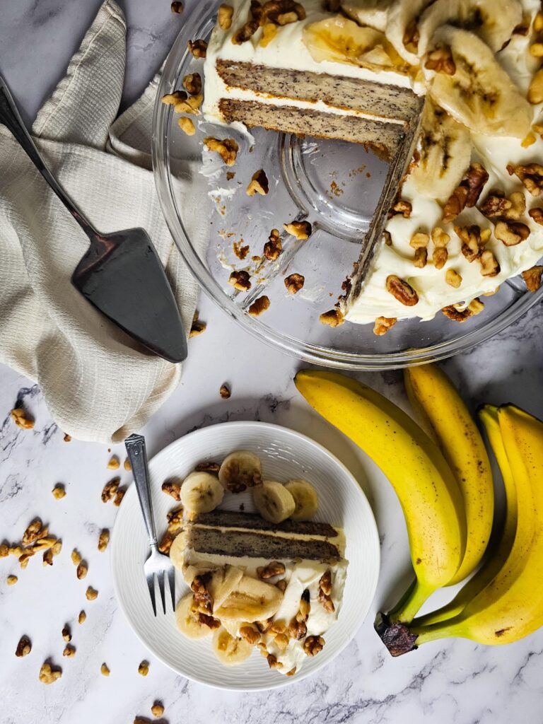 I always store leftover banana cake in an airtight container in the fridge to keep it fresh, especially because of the cream cheese frosting. It usually stays moist and delicious for about 4–5 days. If I want to save it longer, I wrap individual slices and freeze them so I can thaw a piece whenever I’m craving something sweet.