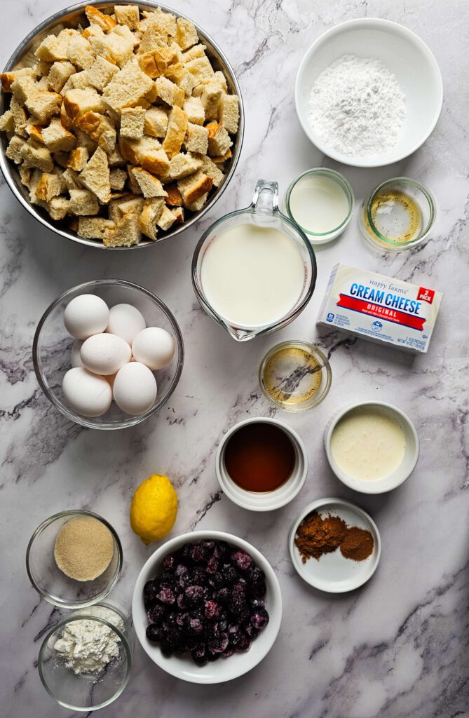 - Repeat Layers: Add the remaining bread cubes to the dish. Top with the remaining cream cheese mixture and the rest of the blueberries.