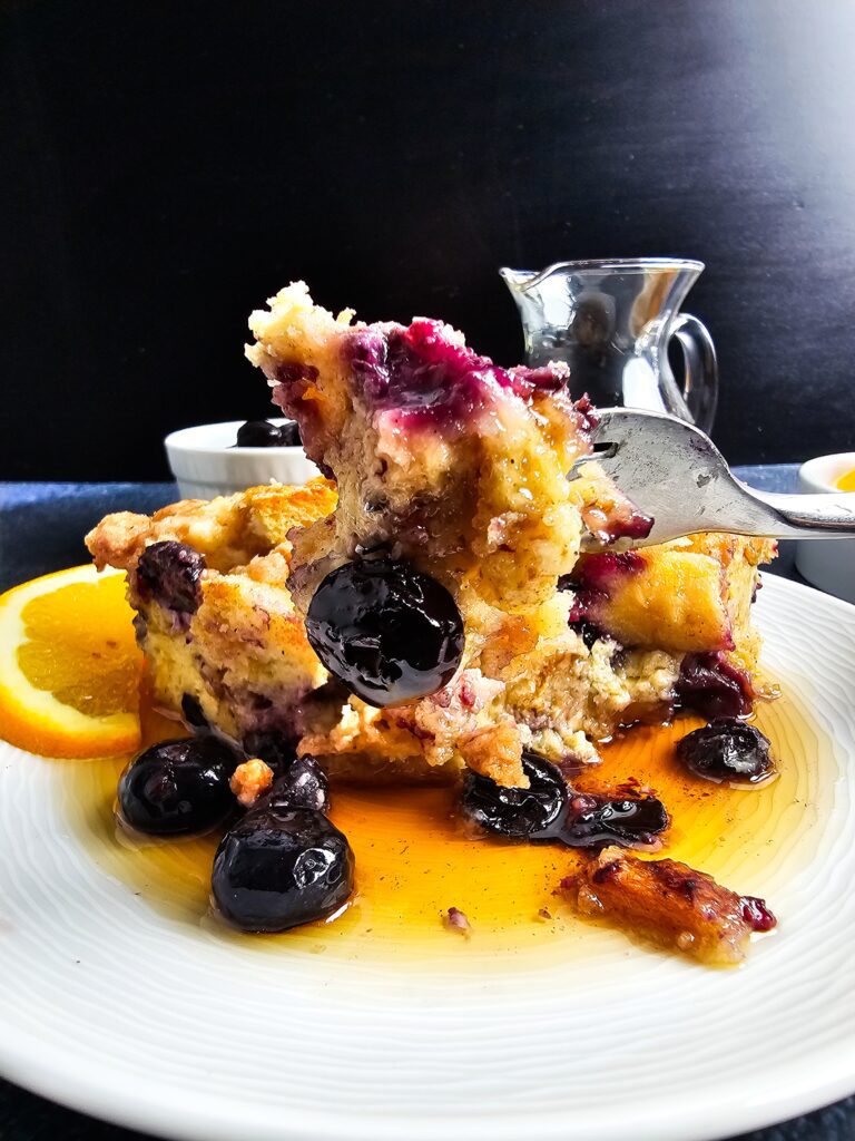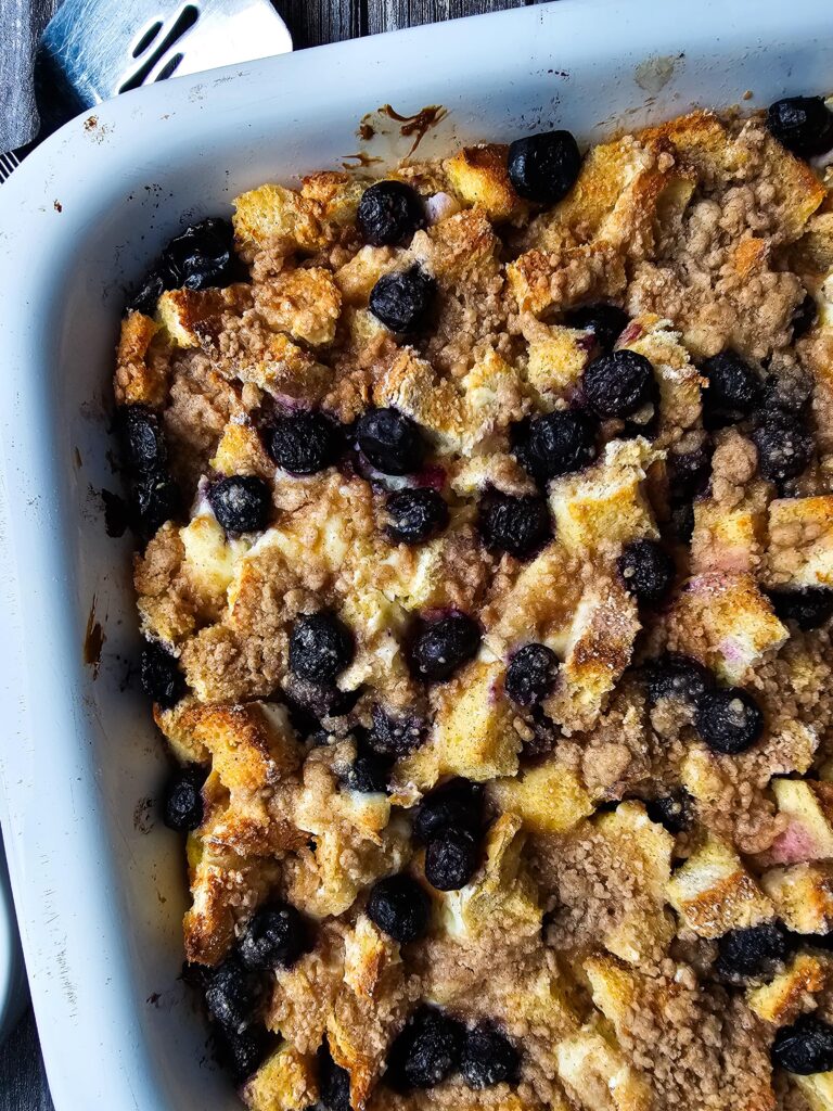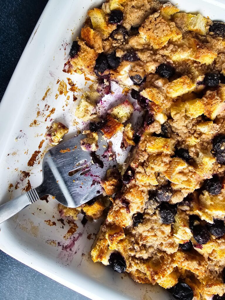 If you have any of this blueberry French toast bake left over, simply cover the dish tightly or move the slices to an airtight container and keep them in the fridge for up to three days. I find that the flavors actually deepen the next day, making it a great “plan-over” for a quick Monday morning breakfast. When you’re ready for more, just reheat a slice in the oven or air fryer to bring back that crunchy streusel texture!