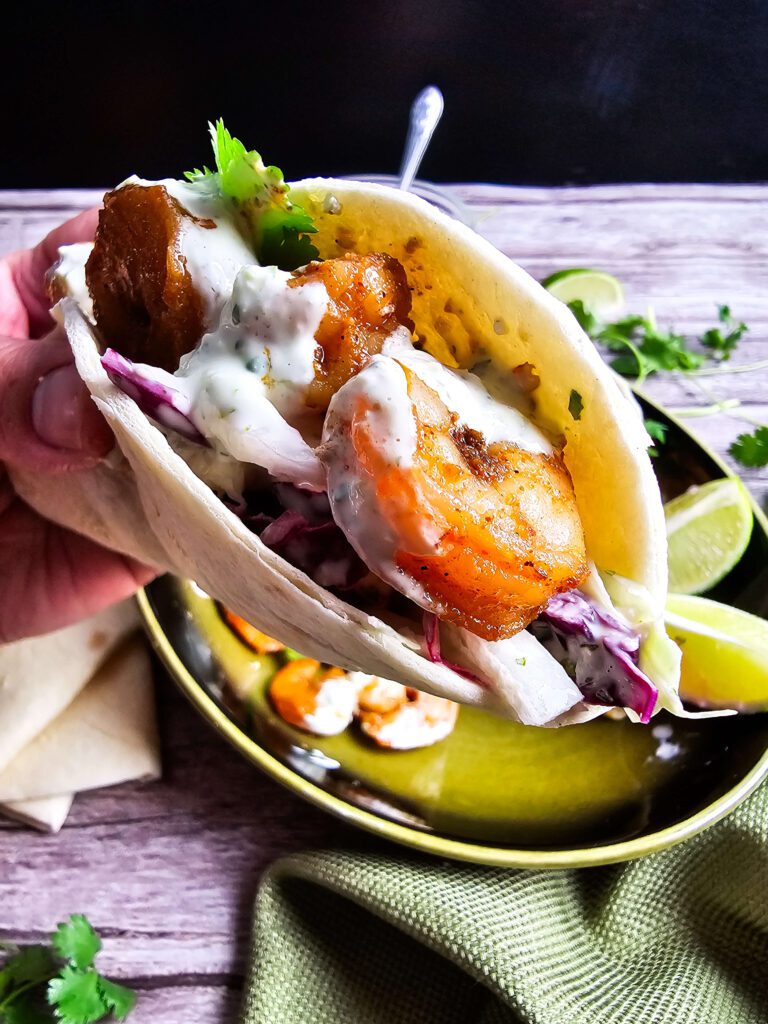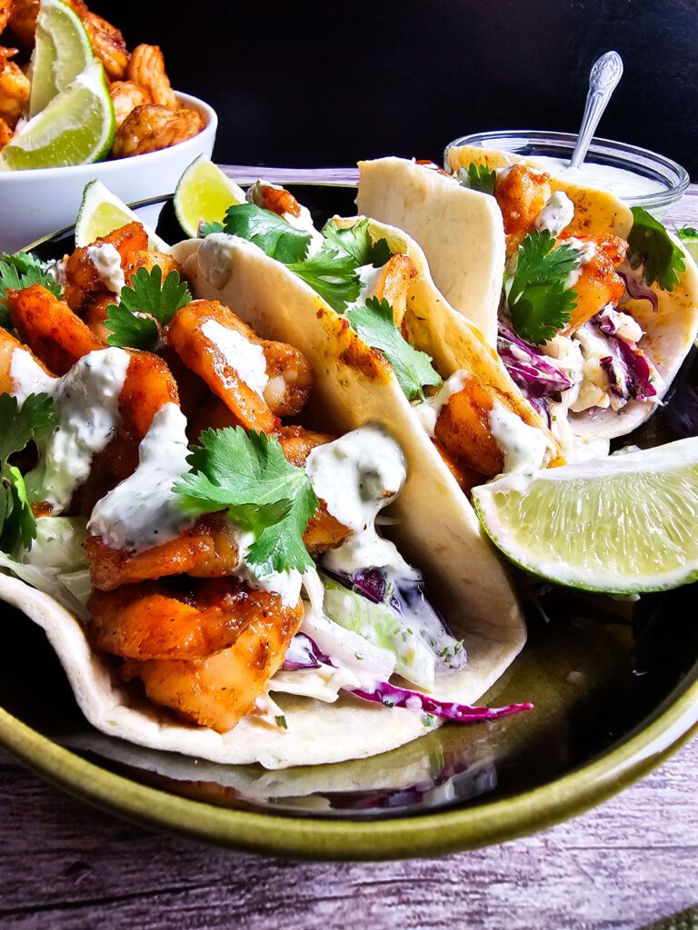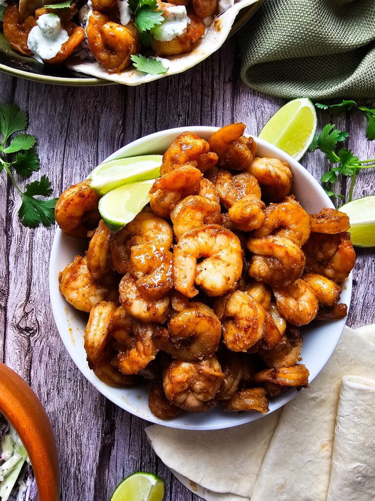 Store leftover shrimp and slaw separately in airtight containers in the fridge. They’ll keep for up to 3 days. Reheat shrimp in a skillet or microwave and assemble fresh tacos when you’re ready to eat.