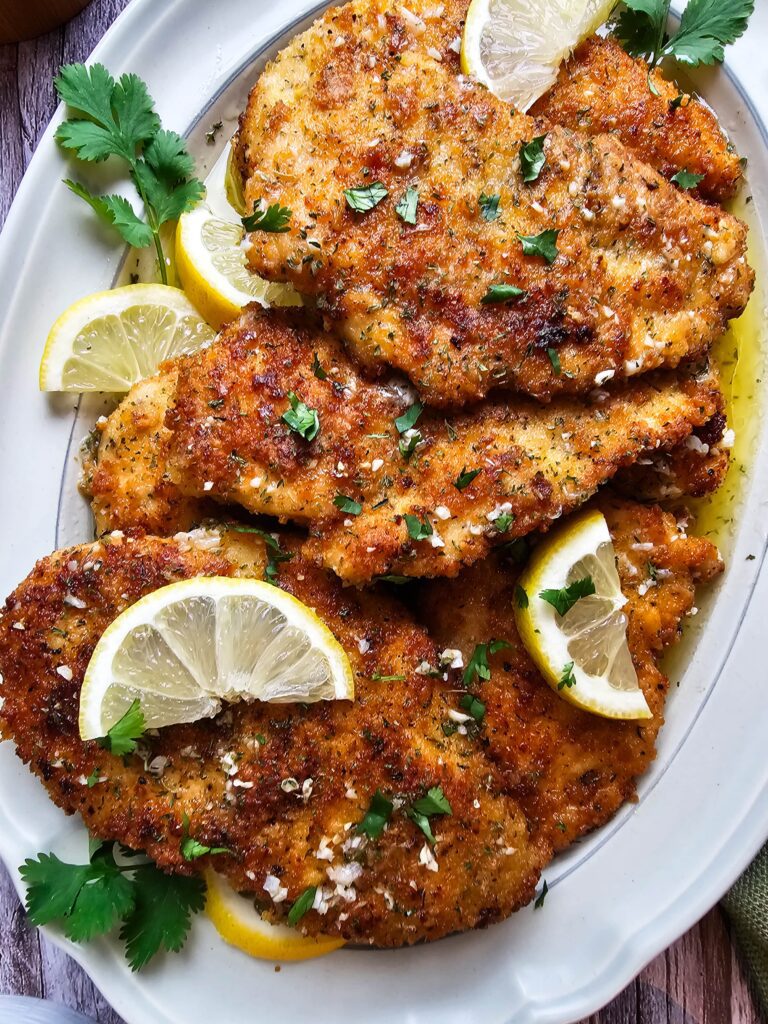 • Finish and Serve: Pour the lemon butter sauce over the crispy chicken cutlets. For a fresh pop of color and flavor, I sprinkle with chopped parsley and add a few lemon slices on top. That’s it—dinner is ready!