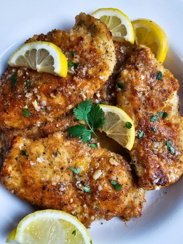 Pour the lemon butter sauce over the crispy chicken cutlets. For a fresh pop of color and flavor, I sprinkle with chopped parsley and add a few lemon slices on top. That’s it—dinner is ready!