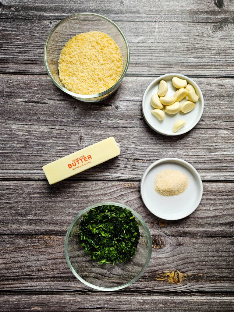 In a small saucepan over medium heat melt ¼ cup butter, add 5 cloves garlic (minced), sauté for 1–2 minutes until fragrant, stir in ¼ cup chopped fresh parsley and ¼ cup grated Parmesan cheese. Remove from heat.