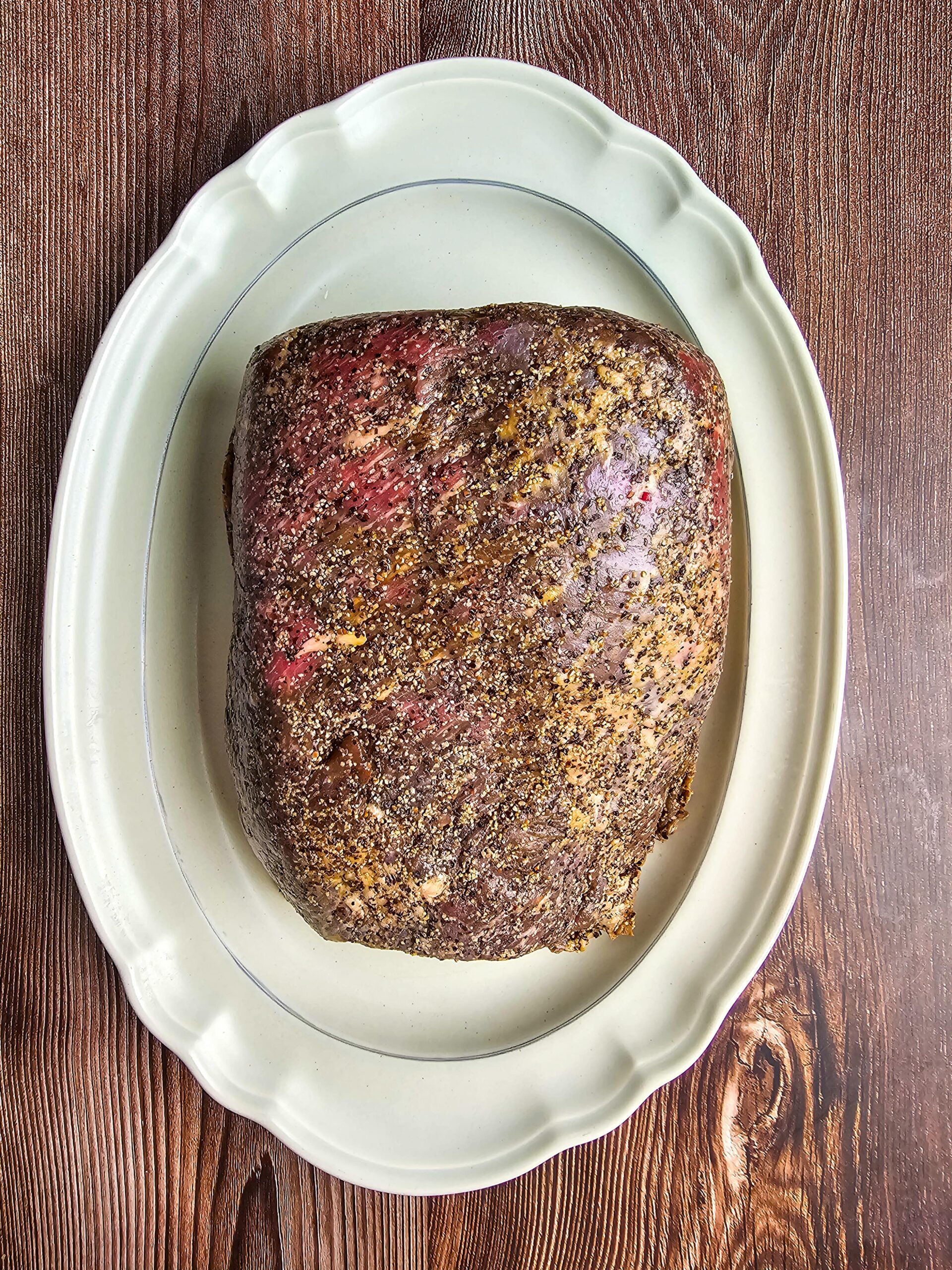 - Rest before roasting (optional but better): Wrap the rubbed brisket in plastic wrap and refrigerate 4 hours or overnight. Bring to room temperature for 30–45 minutes before cooking.
