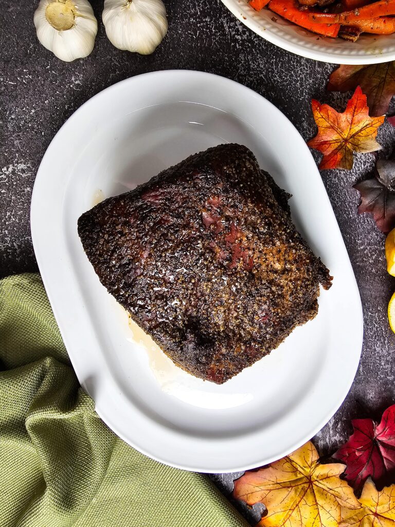 I don’t bother searing it on the stove. Since we are roasting it for several hours, the oven does a great job of developing a beautiful dark crust all on its own.