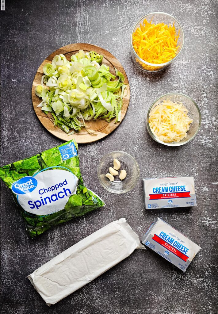 - Mix the cheeses: In a large bowl, combine the softened cream cheese, shredded Gruyère, cheddar, and thyme. Mix until smooth, then fold in the cooked leeks and drained spinach. Season with salt and pepper to taste.