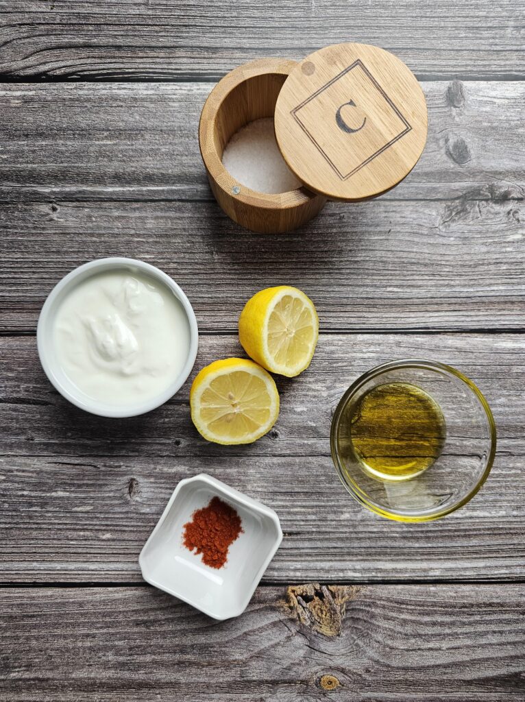 Mix yogurt, smoked paprika, lemon juice, olive oil, and salt.