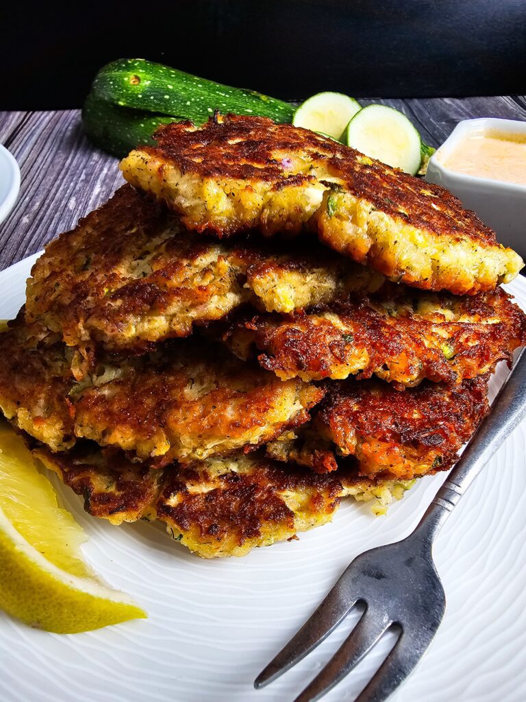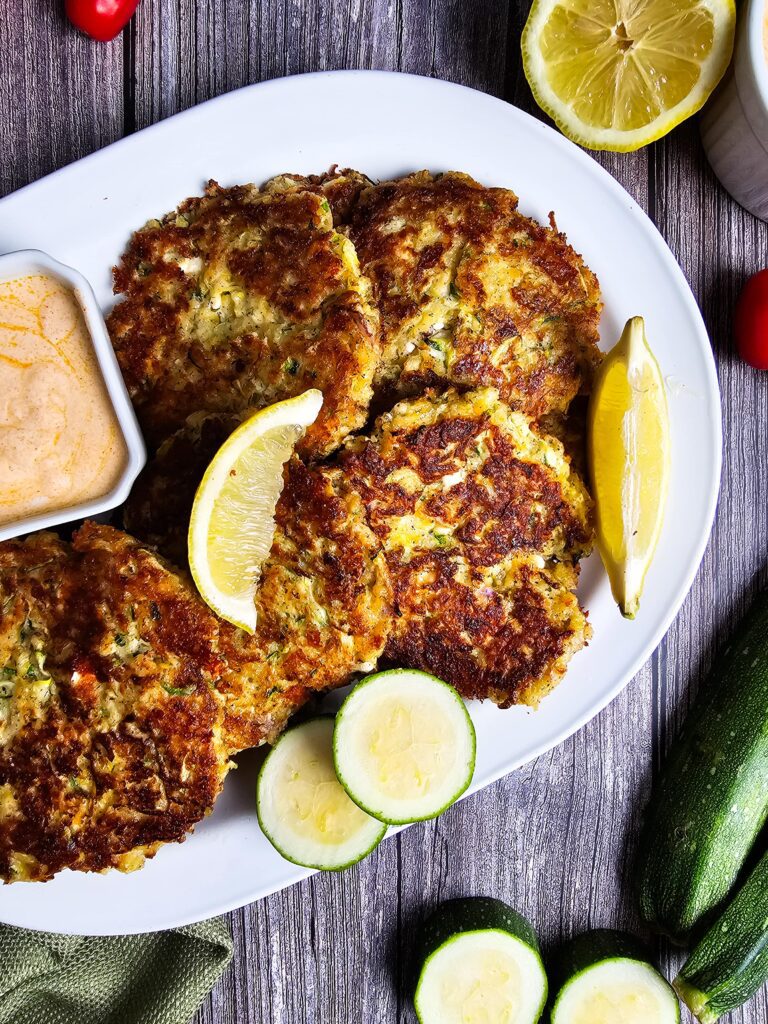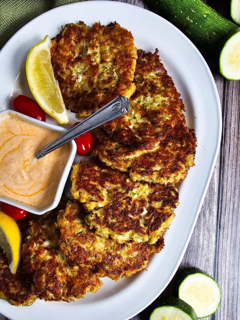I love serving these crispy zucchini fritters with a smoky yogurt dipping sauce or alongside a fresh salad for one of my favorite easy weeknight meals. They also make a great quick vegetarian dinner on their own or a fun appetizer with zucchini when I’m hosting friends. In the summer, they’re one of the best zucchini recipes to bring to potlucks, holiday spreads, or casual family gatherings.