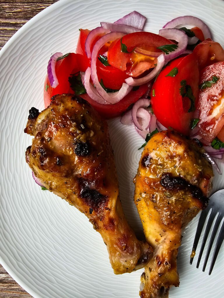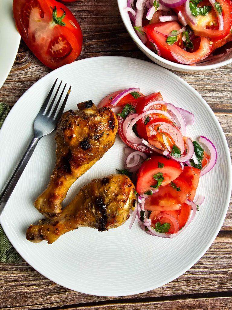 SERVE AND ENJOY CHICKEN LEGS SERVED WITH MARINATED TOMATO SALAD