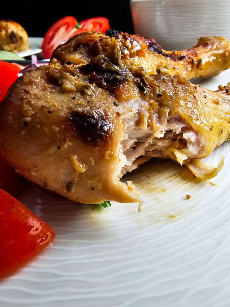 Bake the chicken for 35-40 minutes, flipping halfway through, until the skin is golden and the internal temp hits 165°F. If you want extra crispy skin, broil the chicken on high for 2–3 minutes at the end—just keep an eye on it so it doesn’t burn.