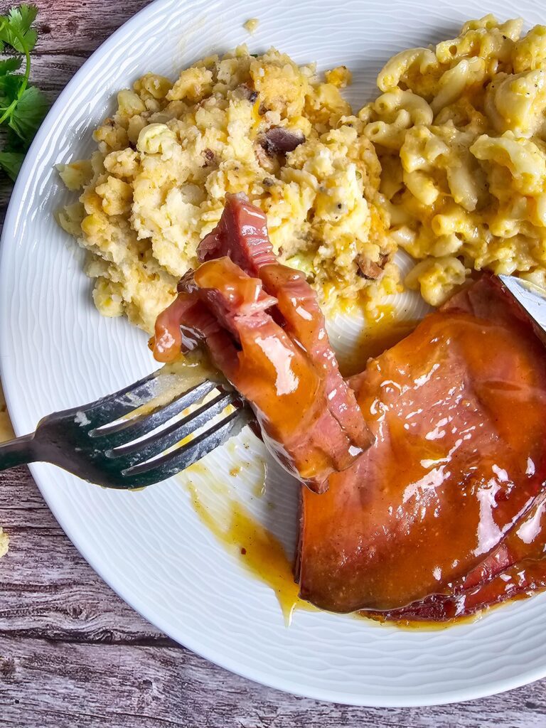I store leftovers in an airtight container in the fridge for about 4–5 days. I save some of the extra glaze to spoon over the ham when reheating so it stays juicy. When I’m ready to reheat, I warm the slices gently in the oven or microwave so they don’t dry out.