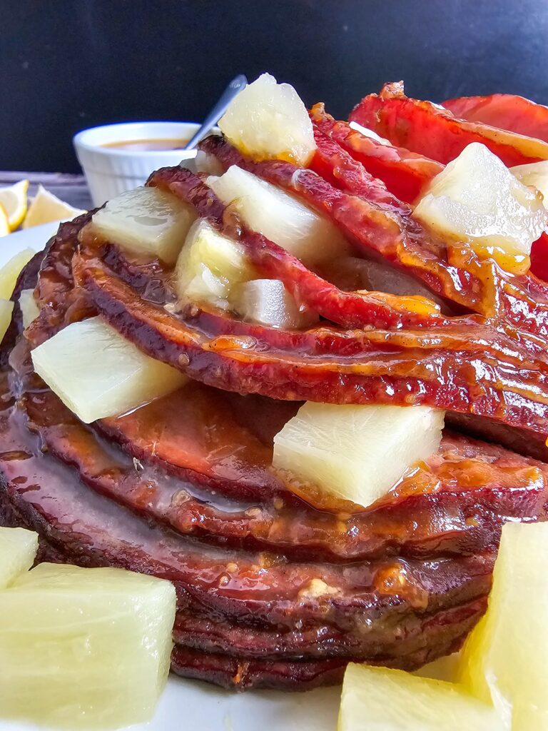 - I tuck pineapple chunks between the slices to make the ham extra juicy and flavorful.