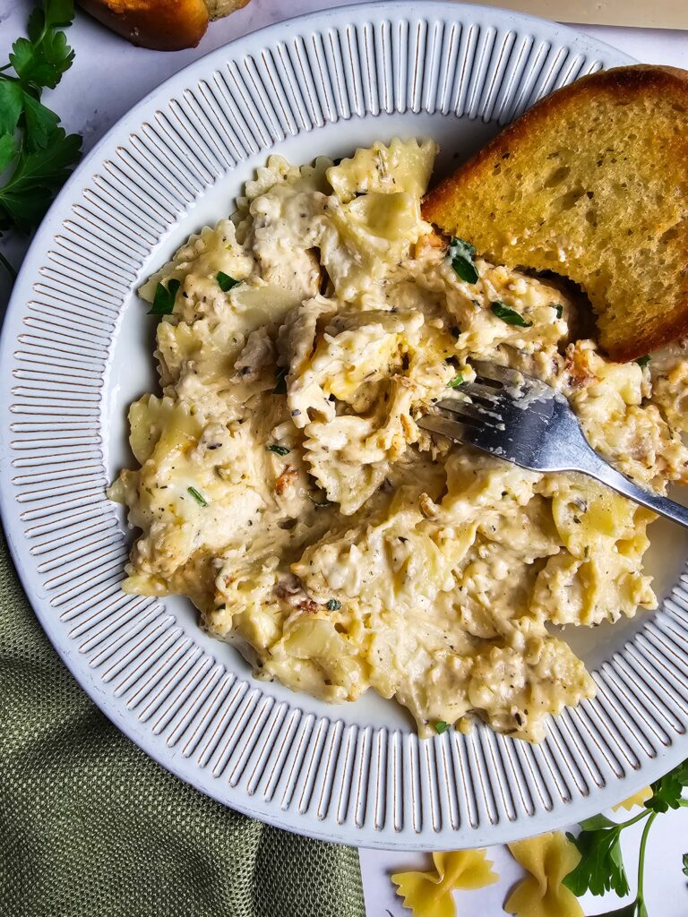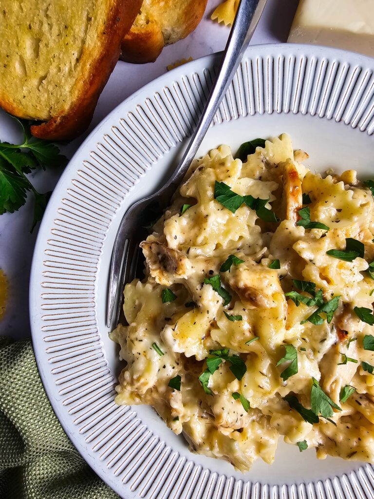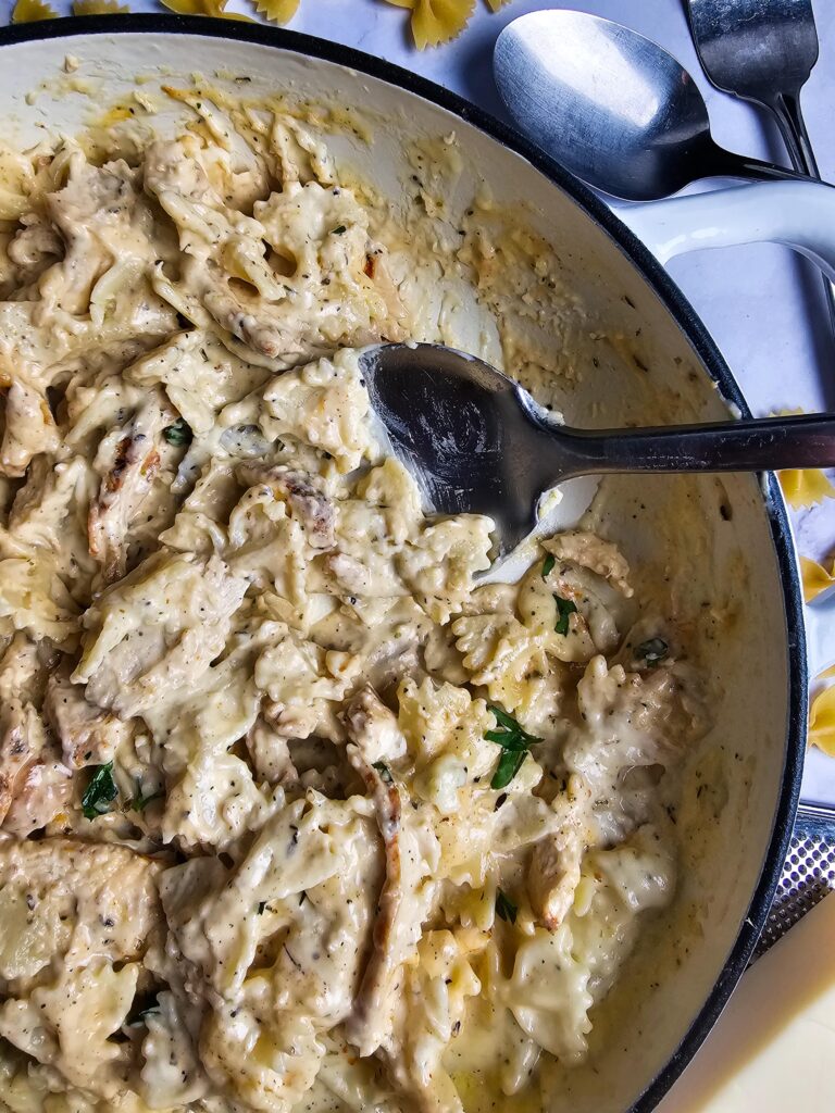 - Use a different pasta – If I don’t have farfalle, I’ll use penne, rotini, or whatever I have in the pantry—it all works.