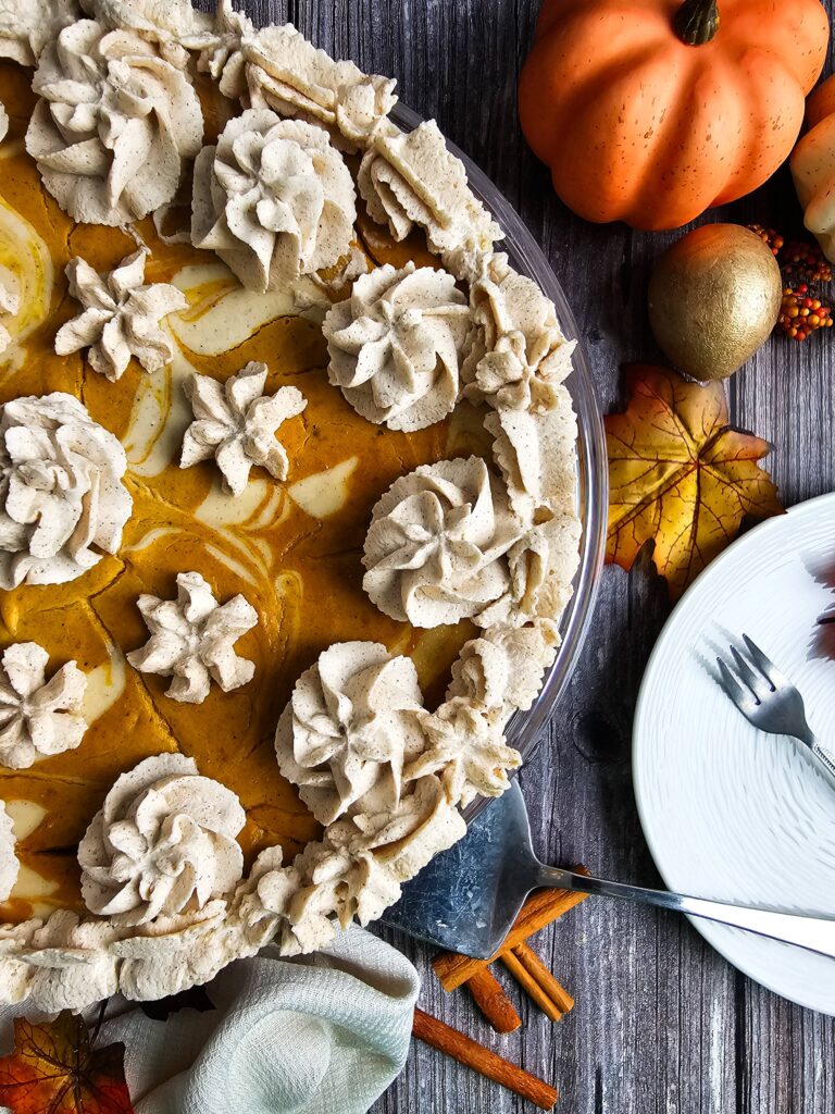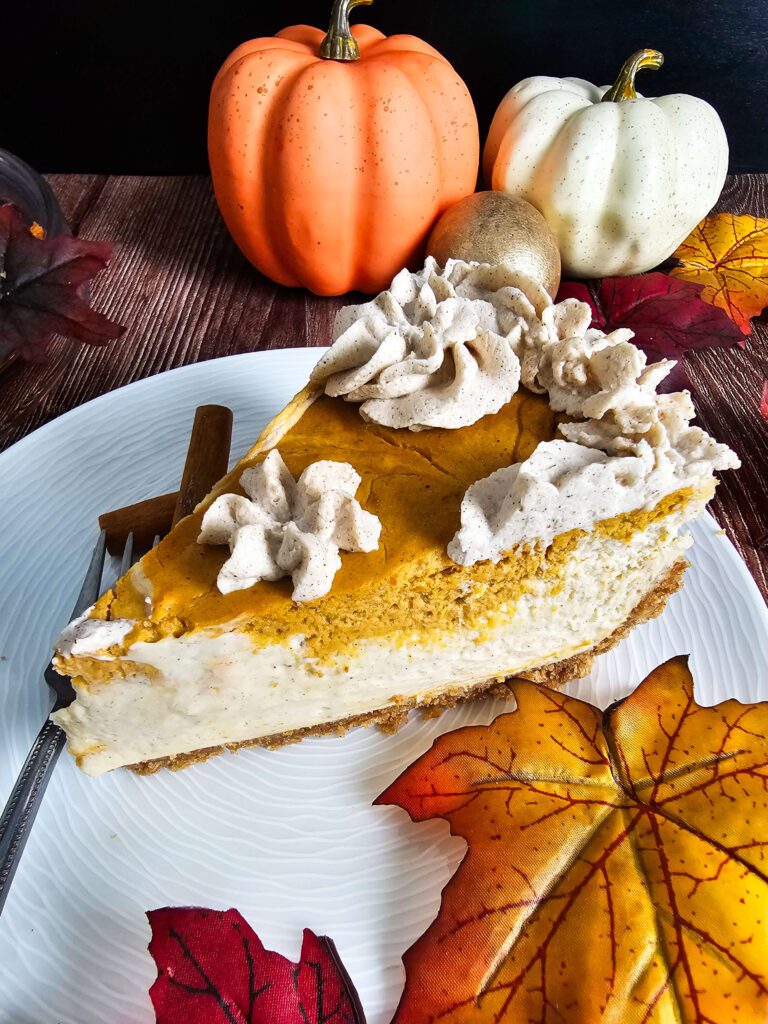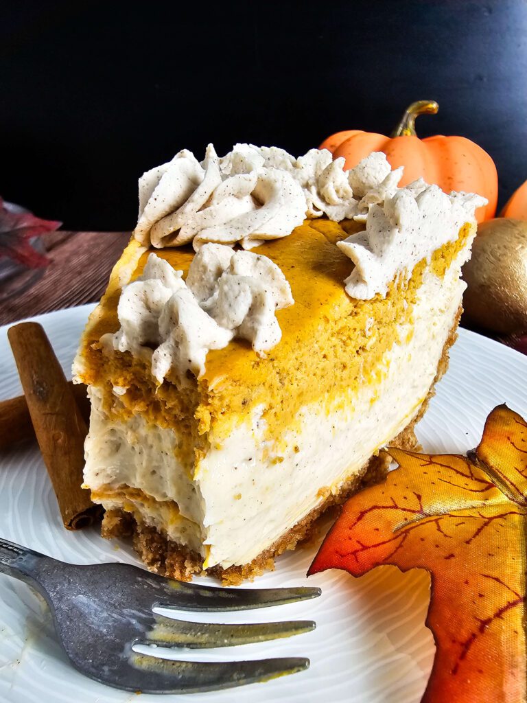 SIDE VIEW OF PUMPKIN SWIRL CHEESECAKE WITH A SLICE REMOVED