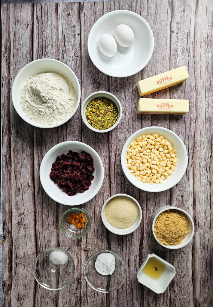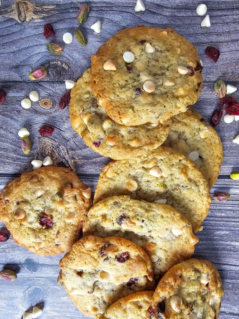 White chocolate chips, Cranberries (plumped + dried), Pistachios