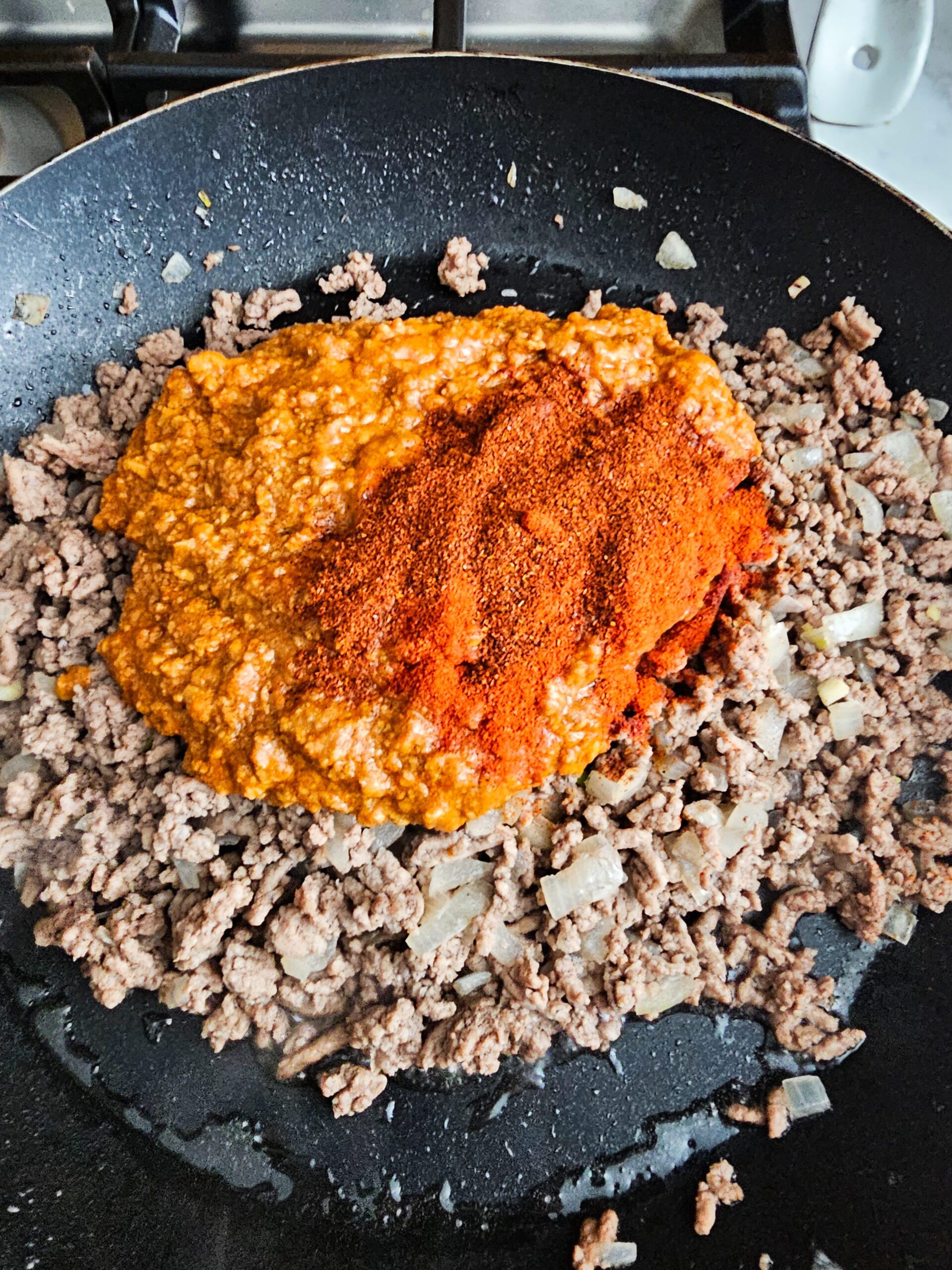 • Add the chili: Stir in the canned chili, chili powder, smoked paprika, salt, and pepper. Let it simmer for 5–7 minutes to deepen the flavor.