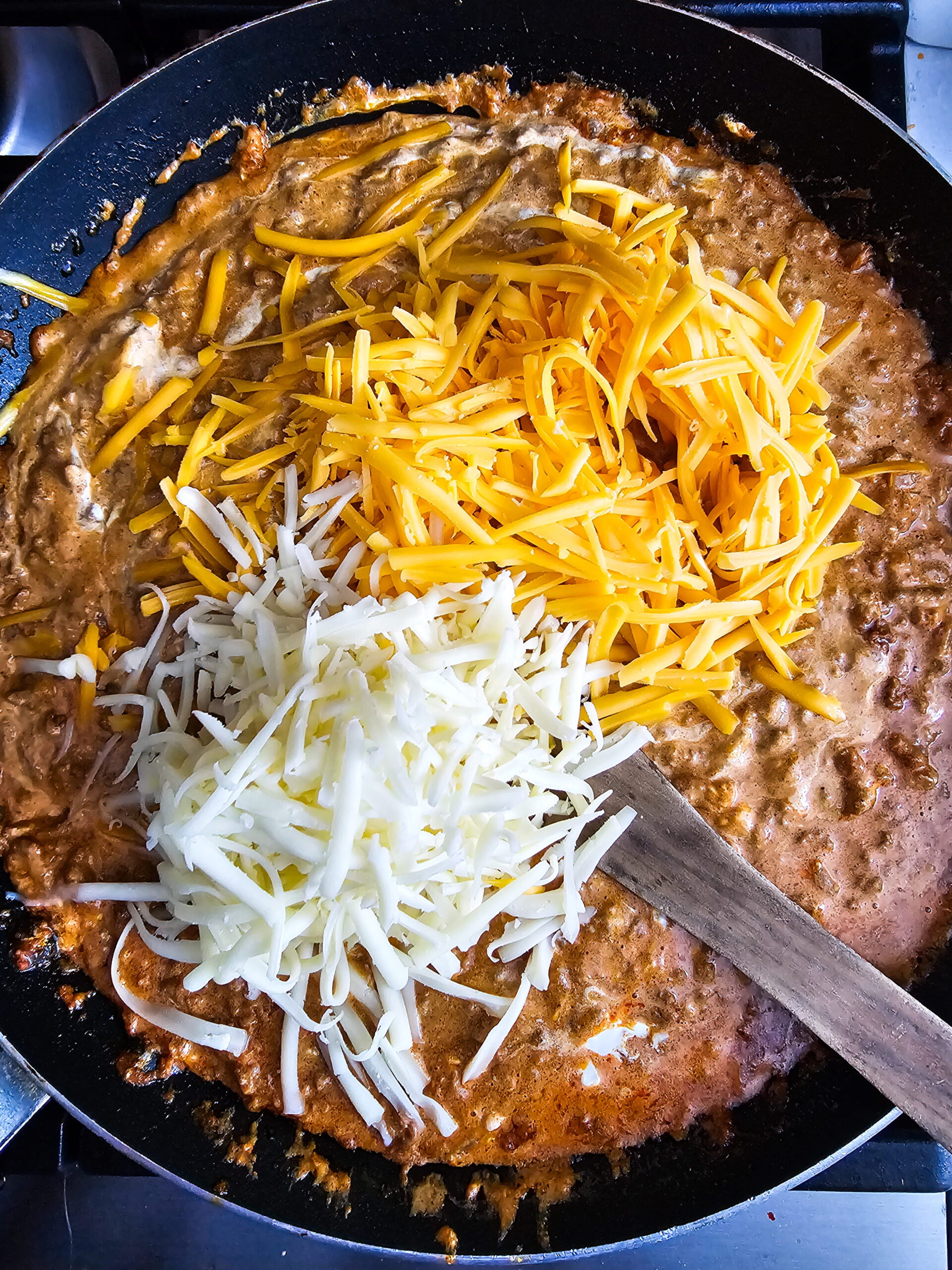 • Add the cheese: Fold in the shredded cheddar and Monterey Jack. Stir until the cheese is melted and the dip is thick and creamy.