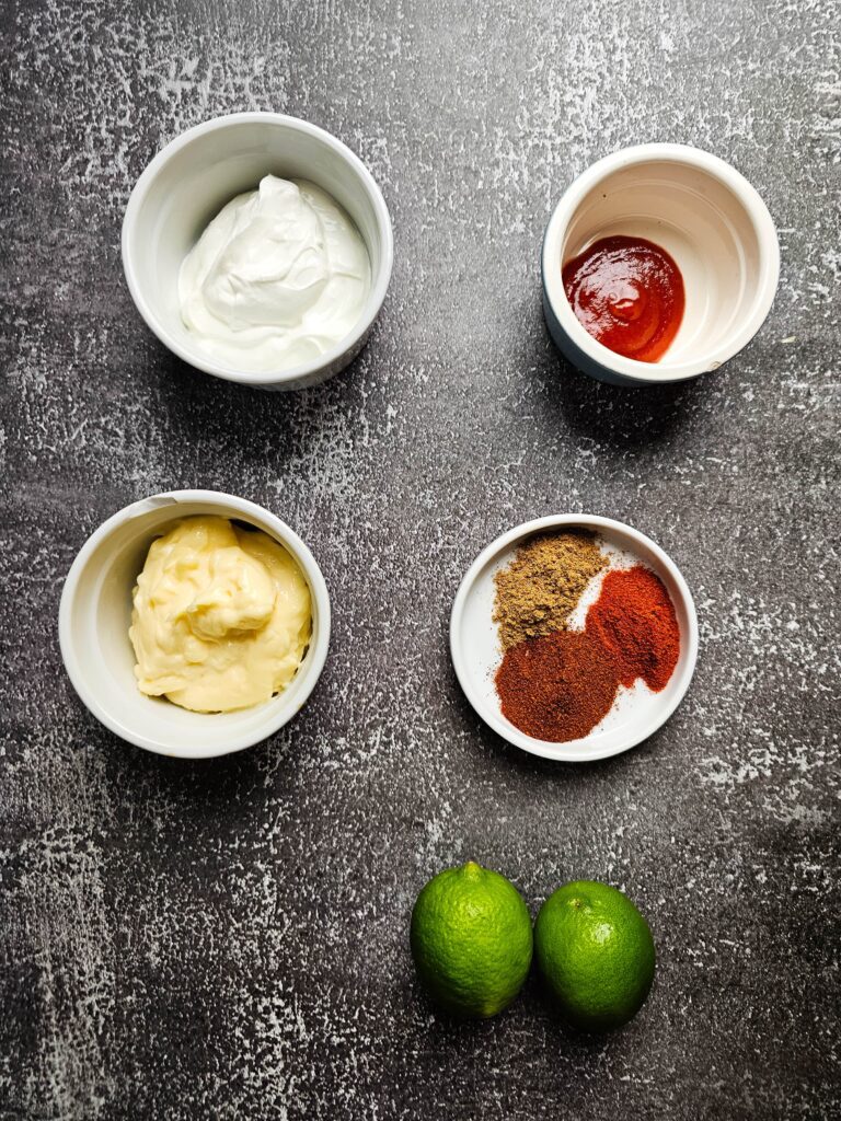 - In a small bowl, mix together ½ cup mayo, ½ cup sour cream, ½ teaspoon chili powder, ½ teaspoon paprika, ½ teaspoon ground cumin, 1 teaspoon sriracha, Juice from 2 limes, pinch of salt and black pepper, Stir until smooth and creamy.