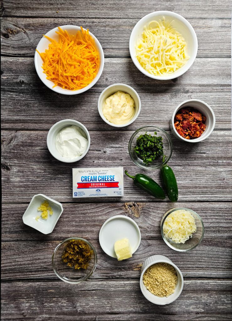 Mix cream cheese, sour cream, mayo until smooth. Stir in cheeses, bacon, jalapeños, garlic, salt.