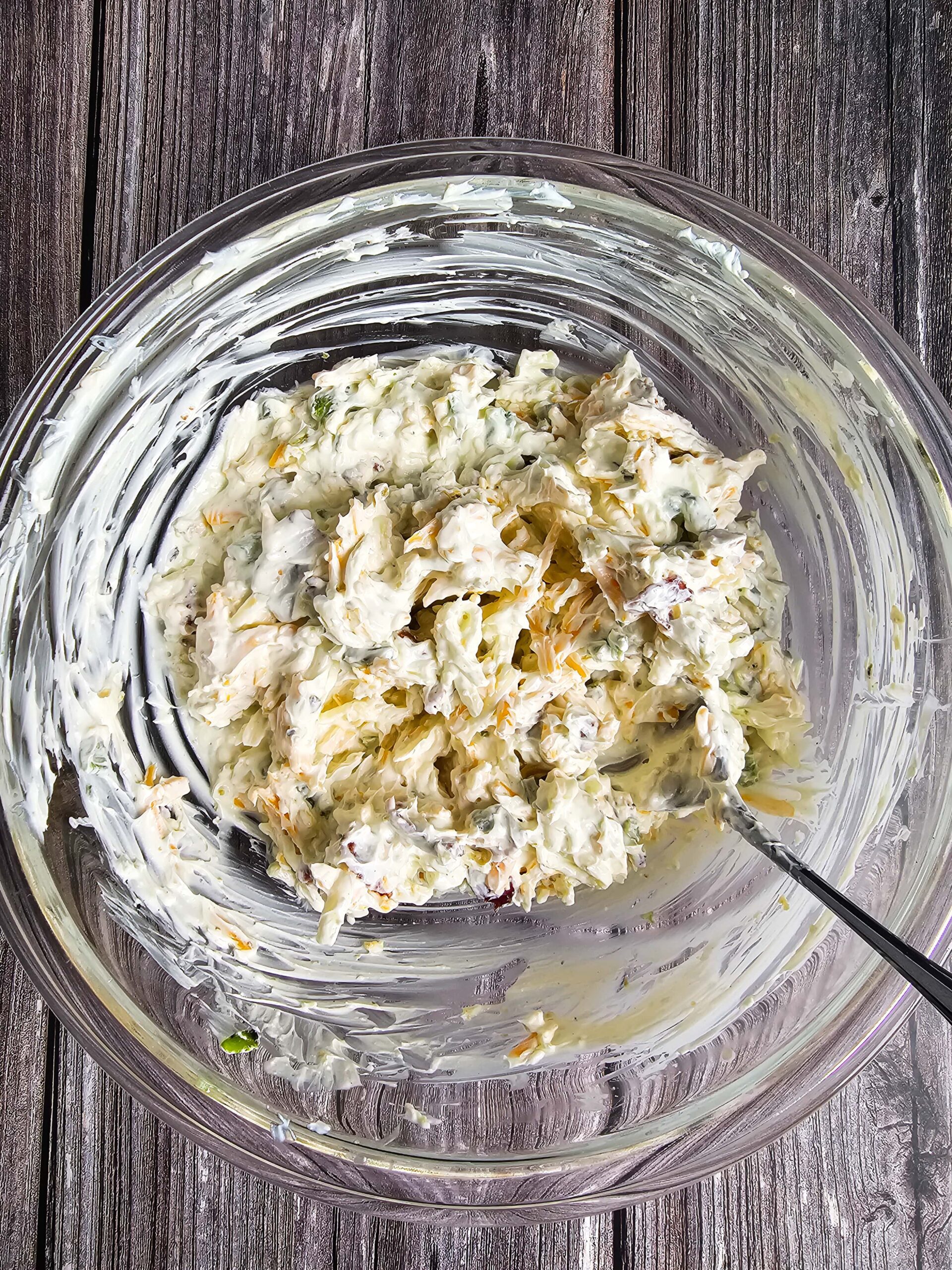 • Stir in cheeses, bacon, jalapeños, garlic, salt.