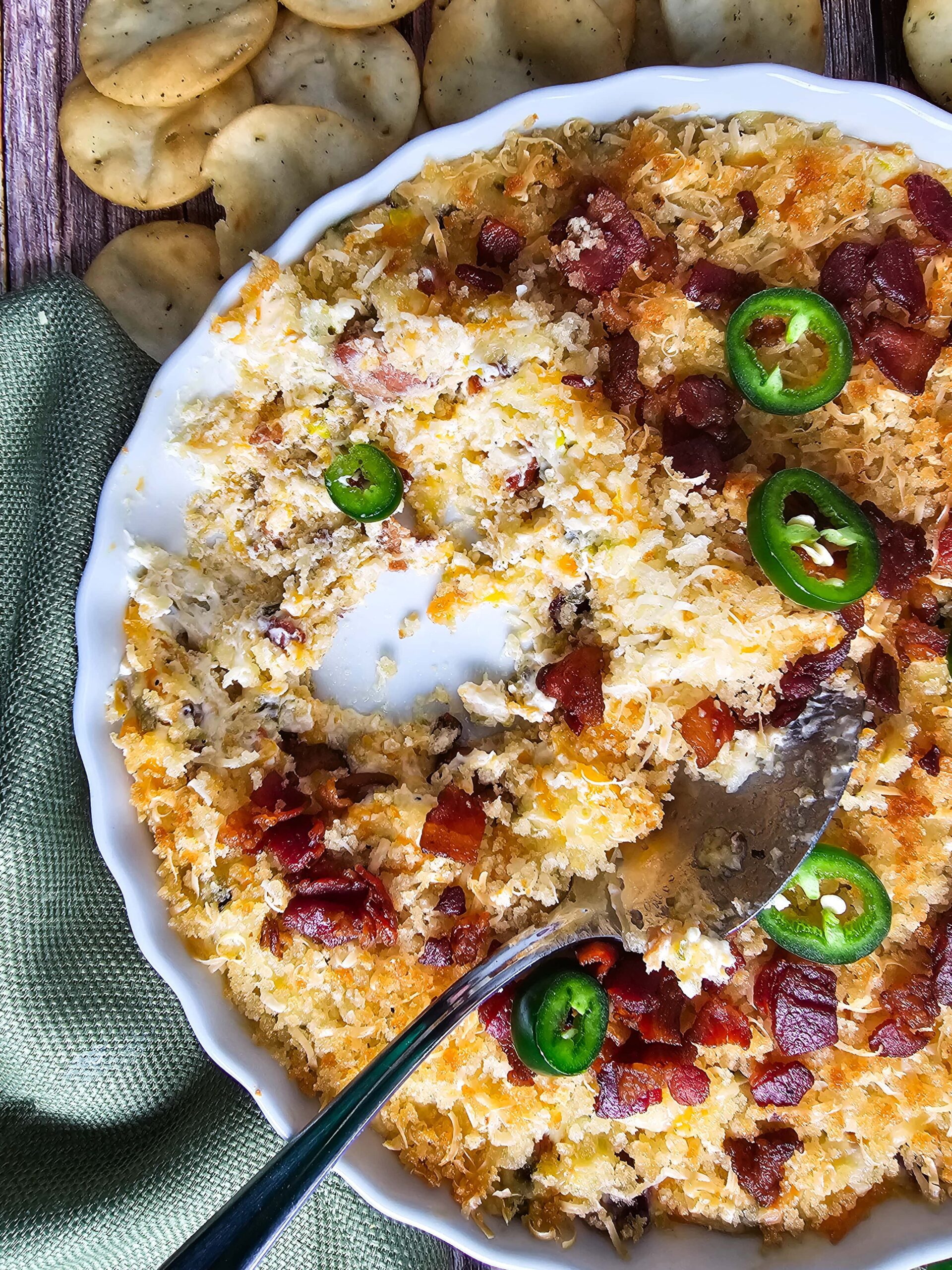 I don’t usually recommend freezing this dip once it’s been baked because the sour cream and mayo can sometimes separate and get a little grainy when they thaw. However, if you really need to, you can freeze the unbaked cheese mixture in a freezer bag for up to a month. When I’m ready to use it, I thaw it in the fridge, spread it in my baking dish, add the fresh panko topping, and bake as usual!
